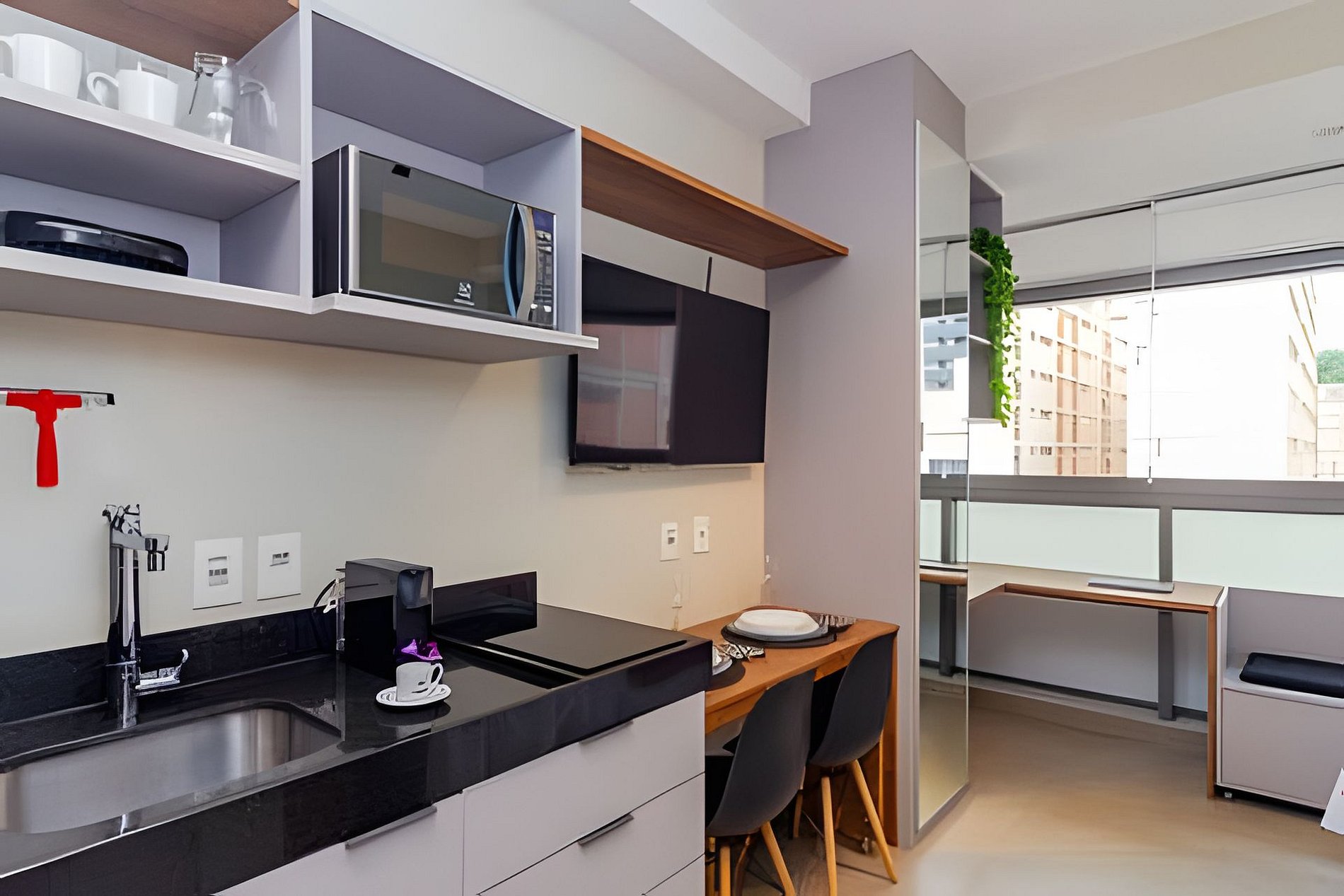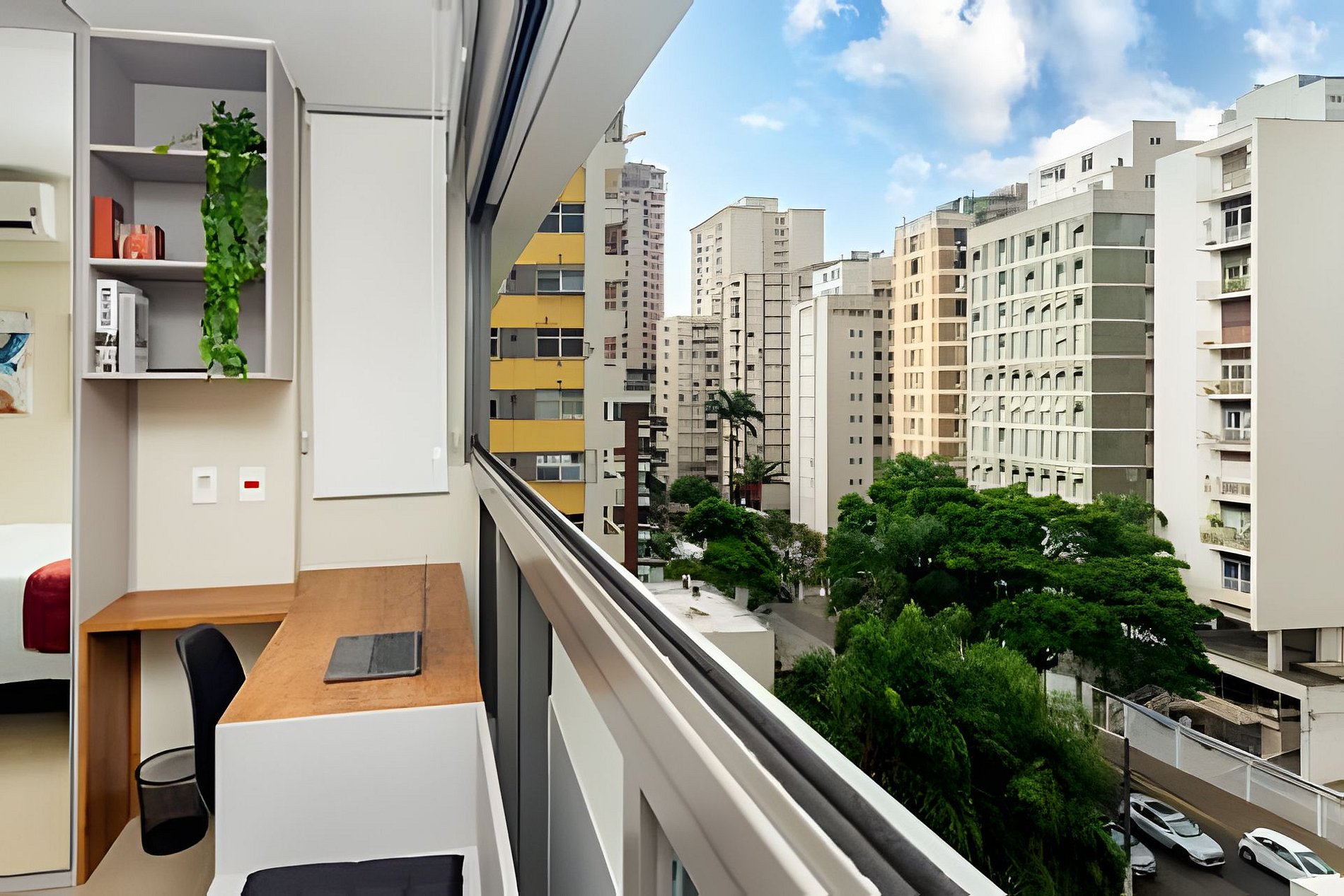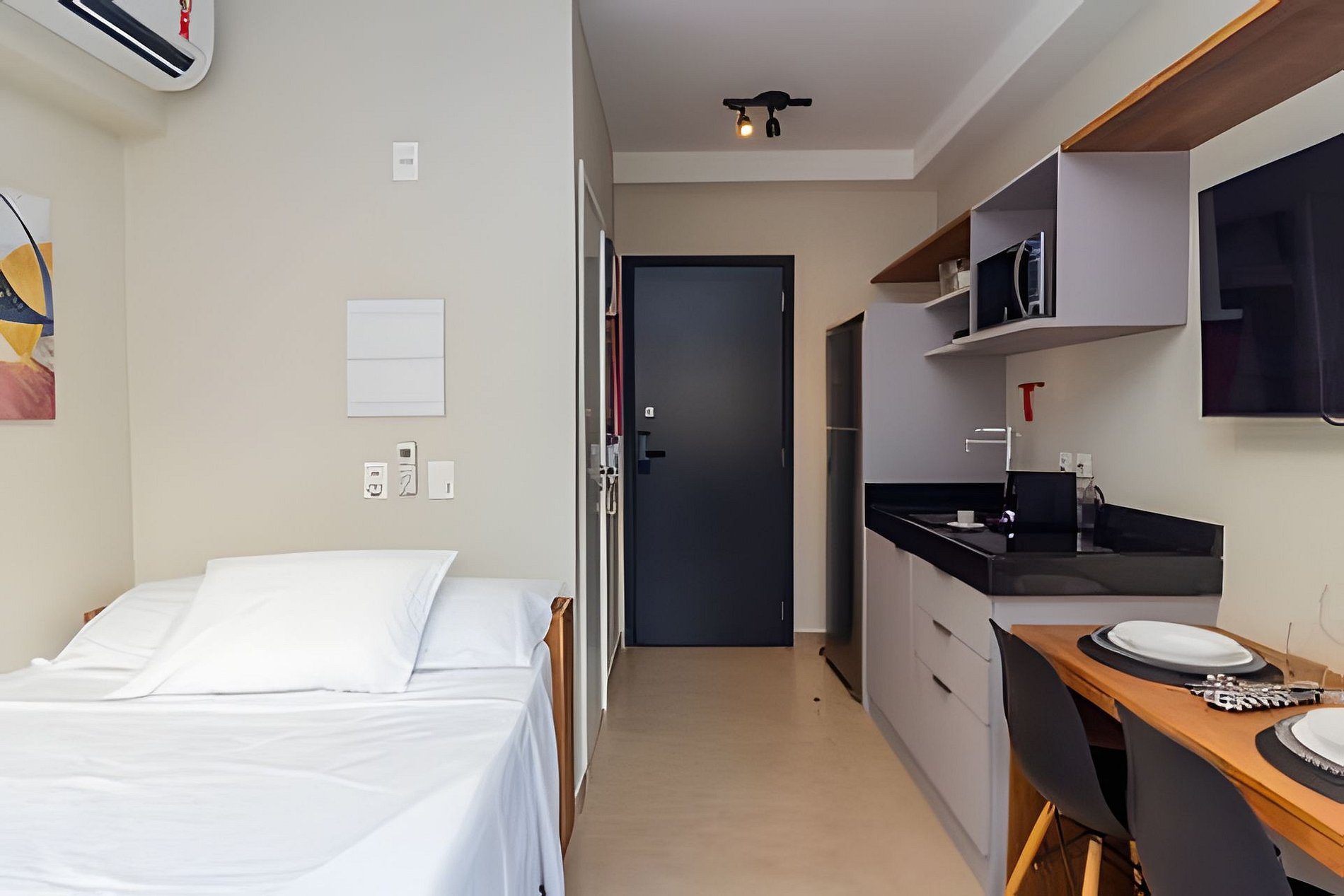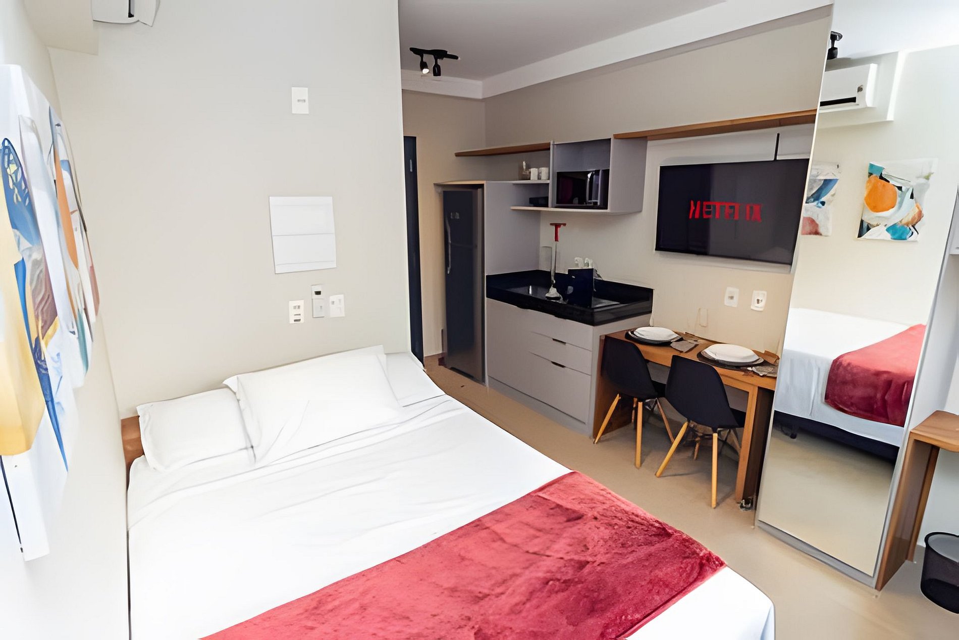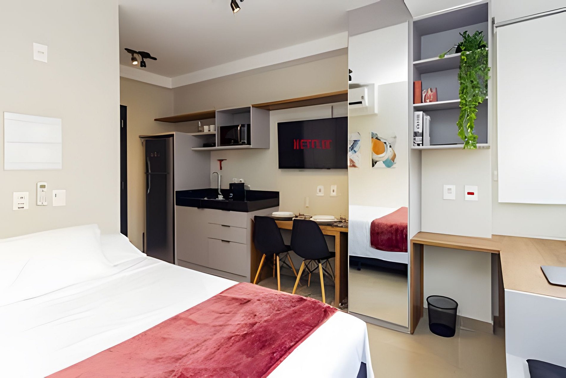 Esse prédio foi pensado para receber hóspedes com conforto e praticidade. Conta com segurança e portaria 24h, além de áreas de lazer completíssimas: coworking, cozinha compartilhada, piscina, academia e até um mercadinho no térreo para facilitar o dia a dia. A recepção é 24horas com segurança e reconhecimento facial.