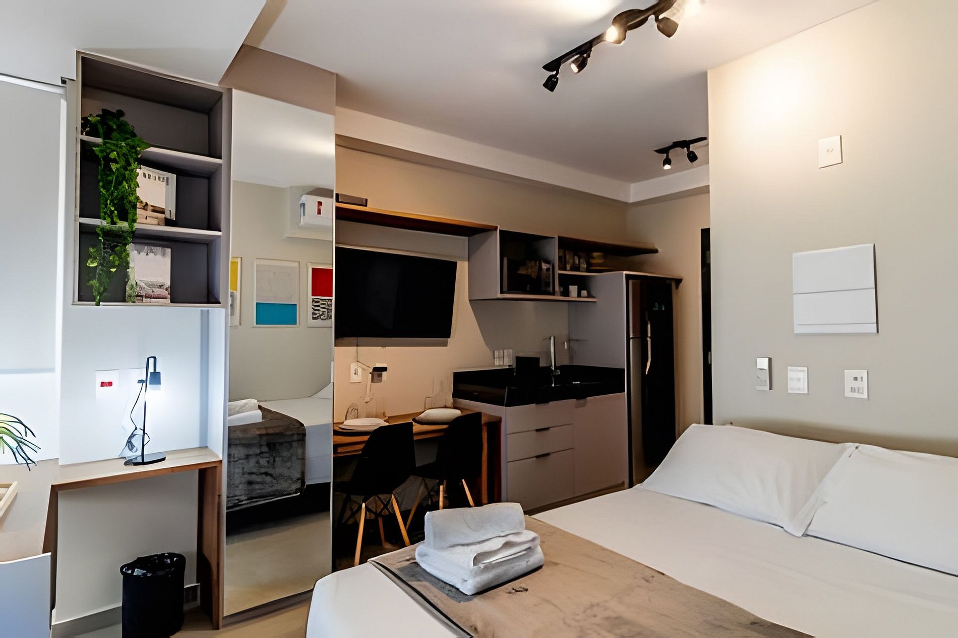 Esse prédio foi pensado para receber hóspedes com conforto e praticidade. Conta com segurança e portaria 24h, além de áreas de lazer completíssimas: coworking, cozinha compartilhada, piscina, academia e até um mercadinho no térreo para facilitar o dia a dia. A recepção é 24horas com segurança e reconhecimento facial.